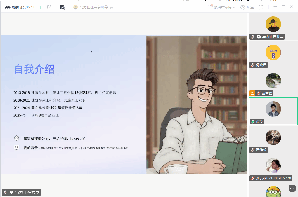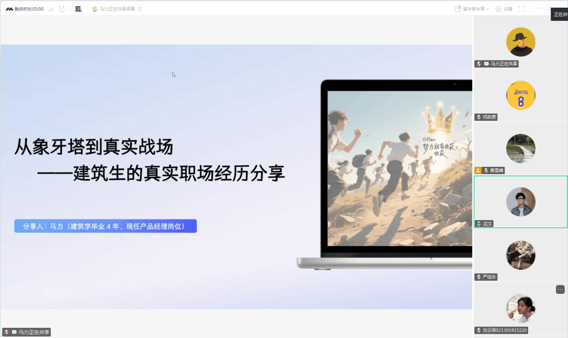 2025年9月16日晚,太阳成集团tyc33455cc通过线上会议平台成功举办了建筑学专业毕业生职场经验分享会。本次会议以“从象牙塔到真实战场——建筑生的真实职场经历分享”为主题,特邀2018届毕业生马力担任主讲嘉宾。太阳成集团tyc33455cc各年级员工、班主任黄雪峰及辅导员何政君共同参与了本次会议。