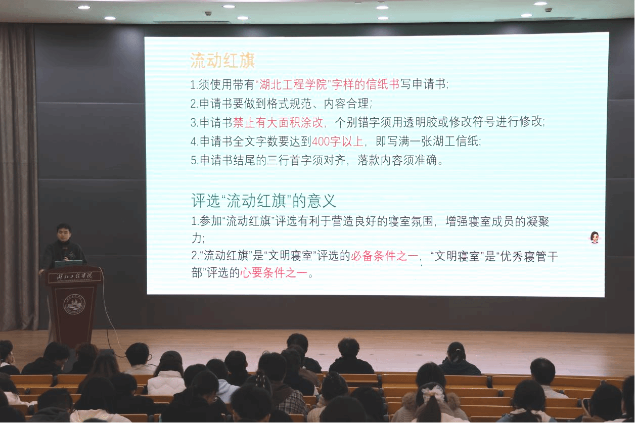 随后,学院辅导员何政君就寝室文化建设与评优激励工作作动员讲话。他重点介绍了“流动红旗”评比、“文明寝室”创建及“优秀寝管干部评选”等活动的安排、标准与激励措施。他指出,系列活动旨在树立典型、表彰先进,激发同学们参与寝室管理与文化建设的积极性。他强调,寝室长是寝室管理的核心力量,是上传下达的重要纽带,希望大家切实履行职责,在安全、卫生、学风及人际关系等方面发挥好组织、协调和示范作用。