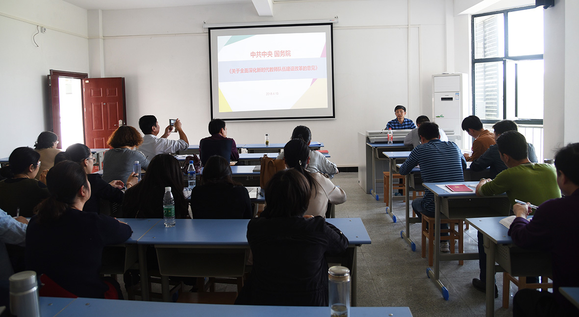4月19日下午,公司全体教职工在天成楼414集中进行政治理论学习暨教工支部主题党日活动,本期的主题是学习《关于全面深化新时代教师队伍建设改革的意见》,活动由党总支书记、经理胡波同志主讲。胡波同志先解读了《太阳成集团tyc33455cc2018年教职工政治理论学习安排意见》,随后从坚持兴国必先强师,深刻认识教师队伍建设的重要意义和改革措施两个方面进行了生动的讲解。同时领学了《省教育厅等五部门关于落实和扩大高校办学自主权深化高等教育领域简政放权放管结合优化服务改革的实施意见》二十条。通过本次学习使全体教职工理解新时代高校教师队伍建设重要意义和总体要求,增强责任意识和使命感,牢固树立自身创新发展的要以。